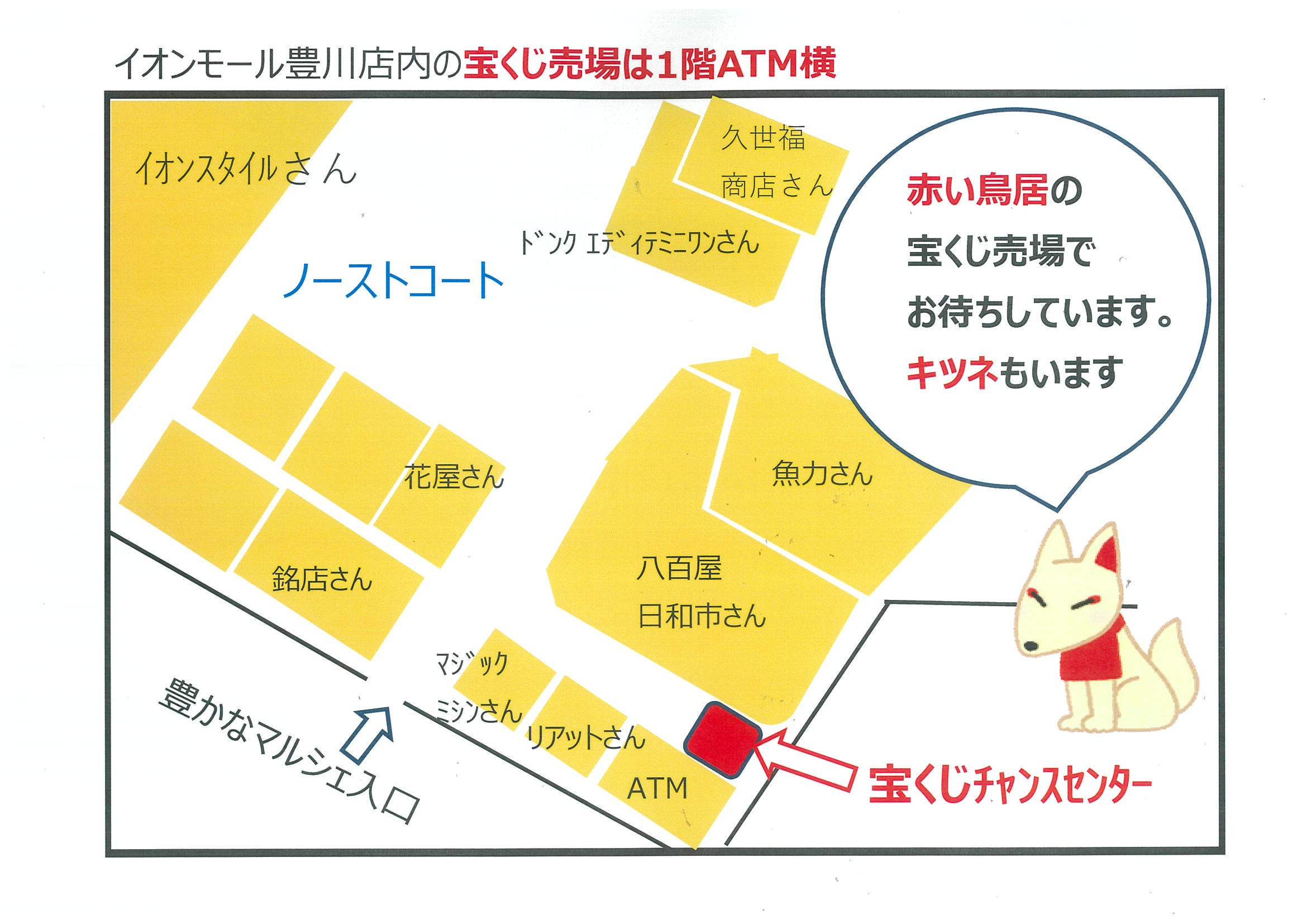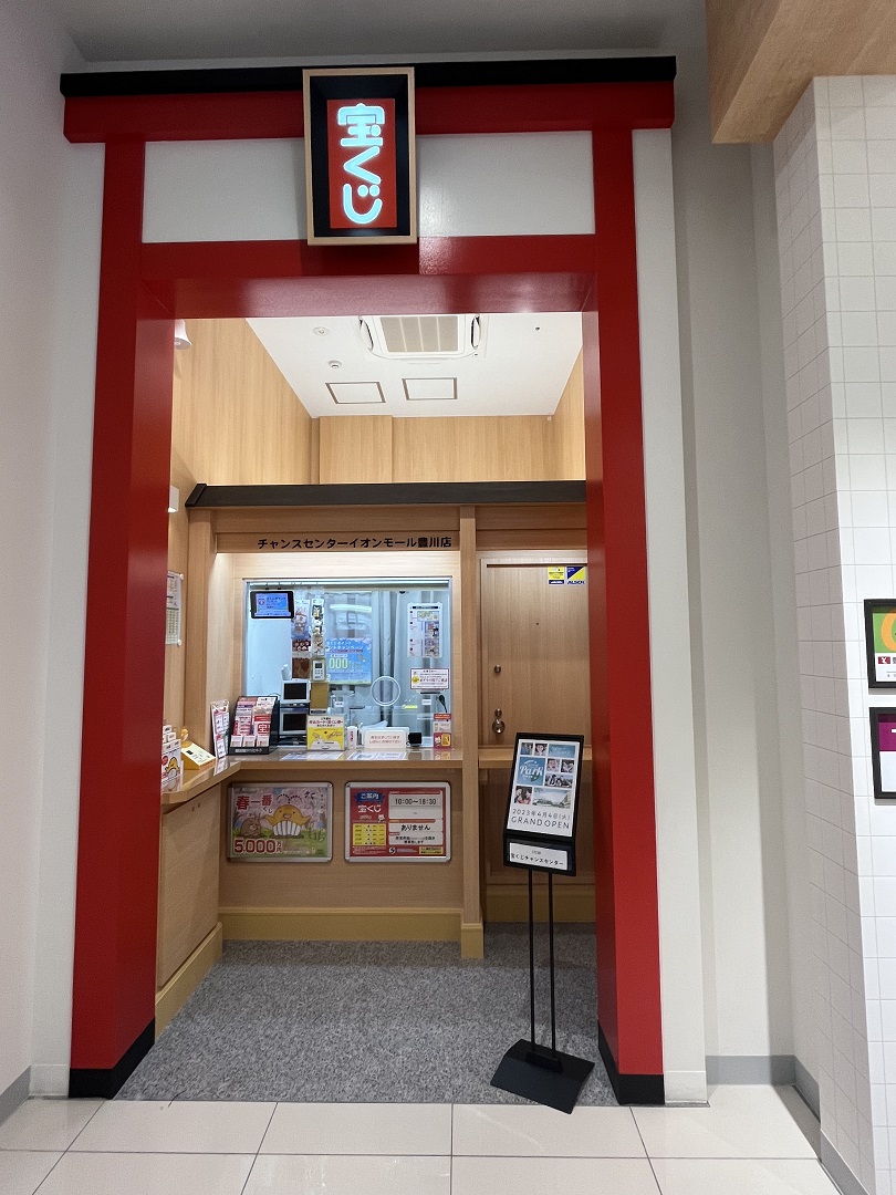 2023年春、緑あふれる杜をイメージしたイオンモール豊川店が東三河に初出店、宝くじ売場は店内1階にあり、赤い鳥居がお迎えするグッとシックな装いです。