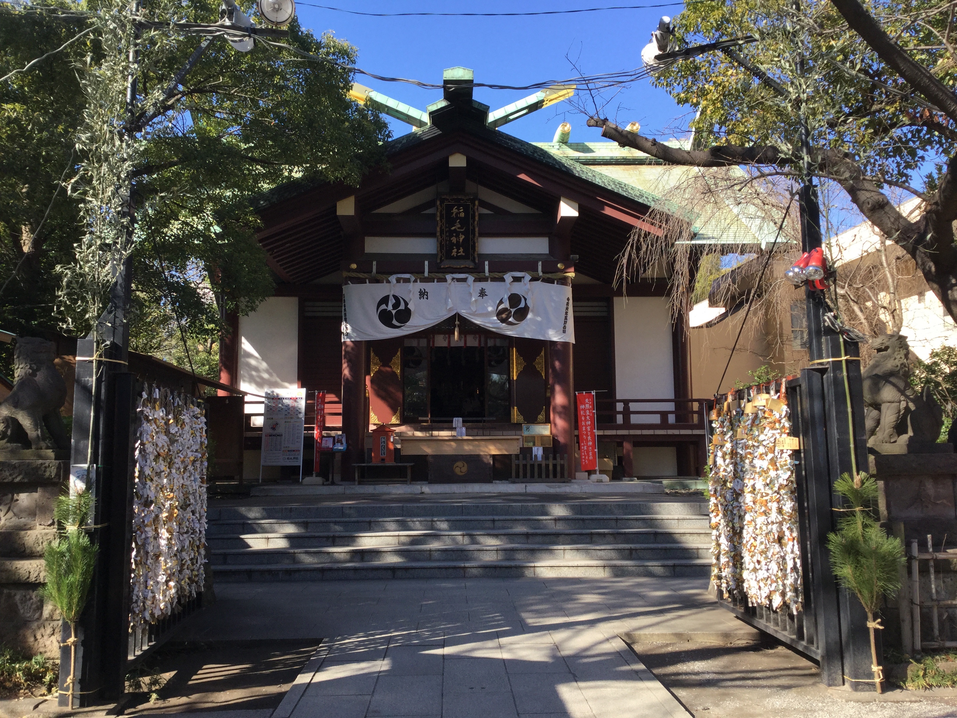 稲毛神社の御神徳は勝と和です。拝殿・本殿前の門には金色に輝くおみくじが多く結びつけられています。稲毛神社の「勝」は勝負に勝つ、につながり、末社の「開運招福」(大神宮)、「福徳」(金刀比羅宮)が広義の意味で「金運」にもつがなると金運祈願する参拝客も多く訪れます。