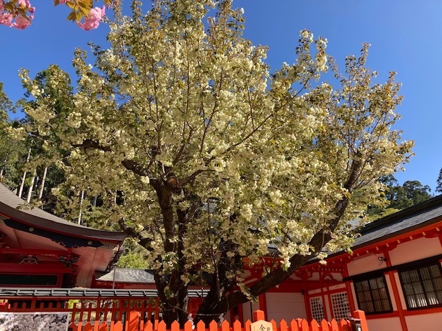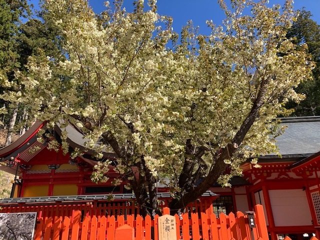 本殿の手前にあるのが、「鬱金の櫻」。神社名の由来となっていて、民謡で唄われている「金の成る木の金櫻」として崇められています。
