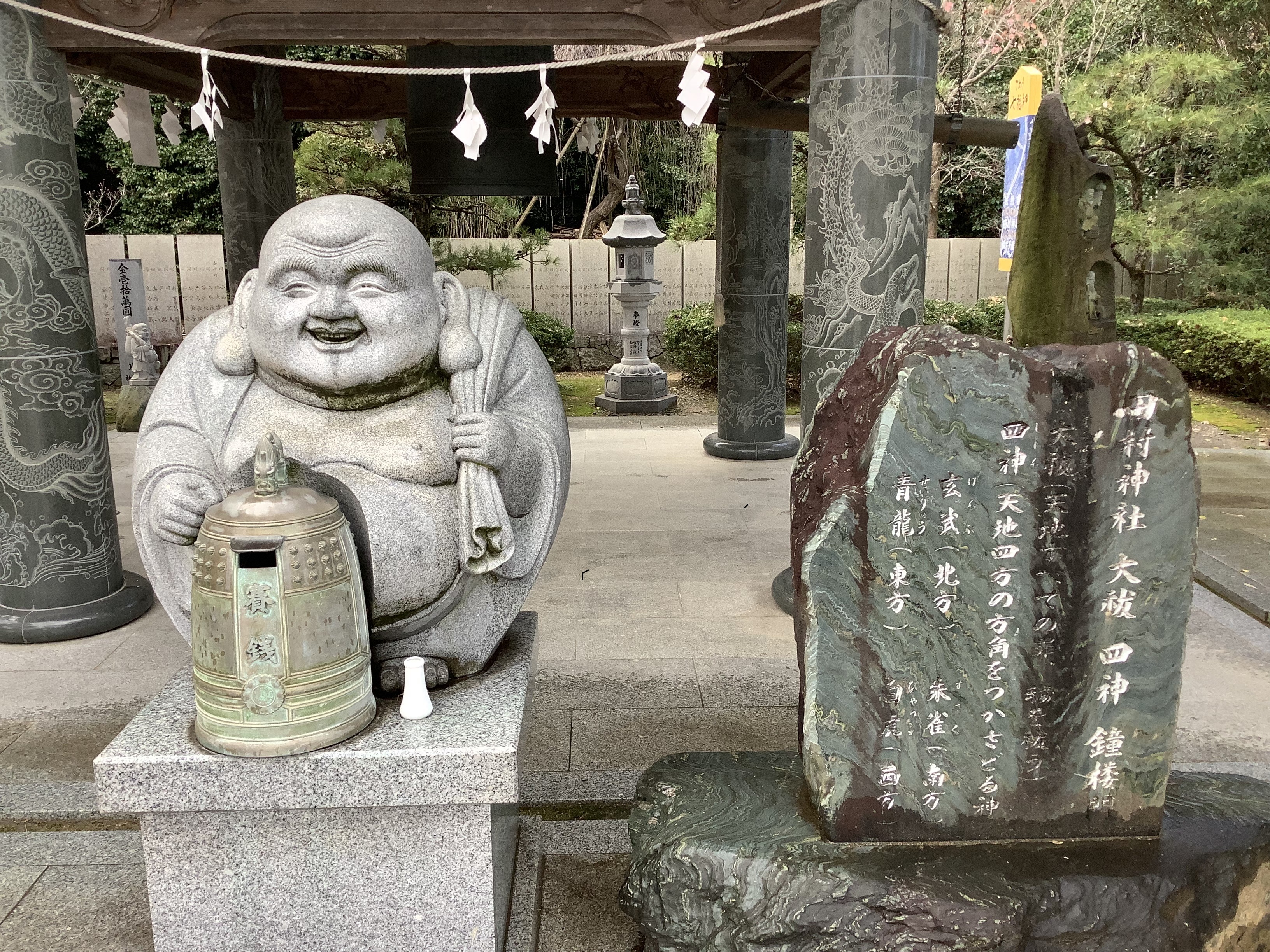 田村神社は讃岐七福神めぐりの一つにもなっており、境内にはたくさんの布袋様がいらっしゃいます。いかにも「福」を授けてくれそうです。御利益には「財運金運上昇」もあり、宝くじを布袋様の大きなお腹に持っていけば、大当たり!も!?