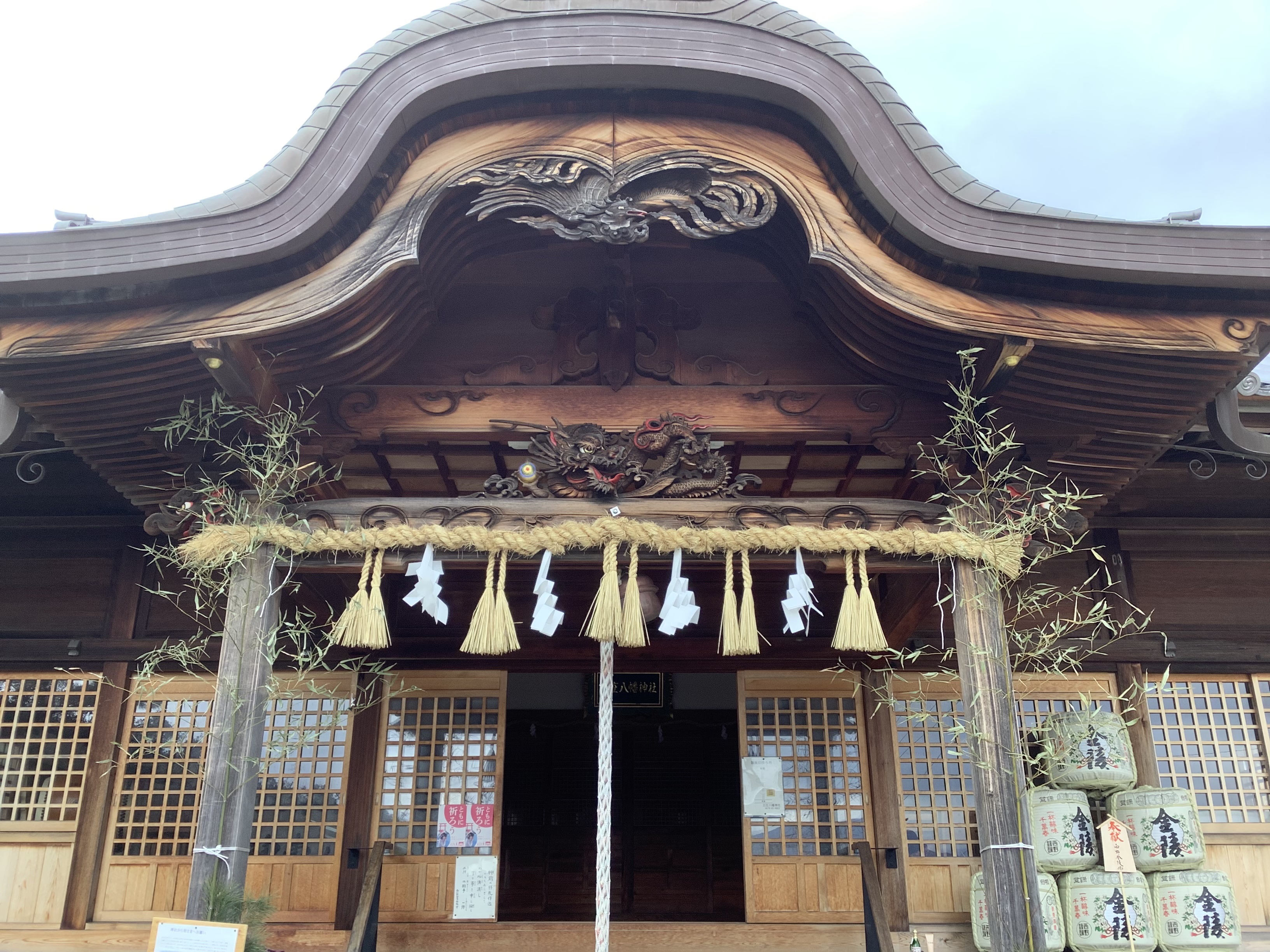 鳥居をくぐり階段を上がると、唐破風向拝をつけた立派な拝殿が構えています。拝殿前の春日灯ろうと狛犬は見事な彫りです。
