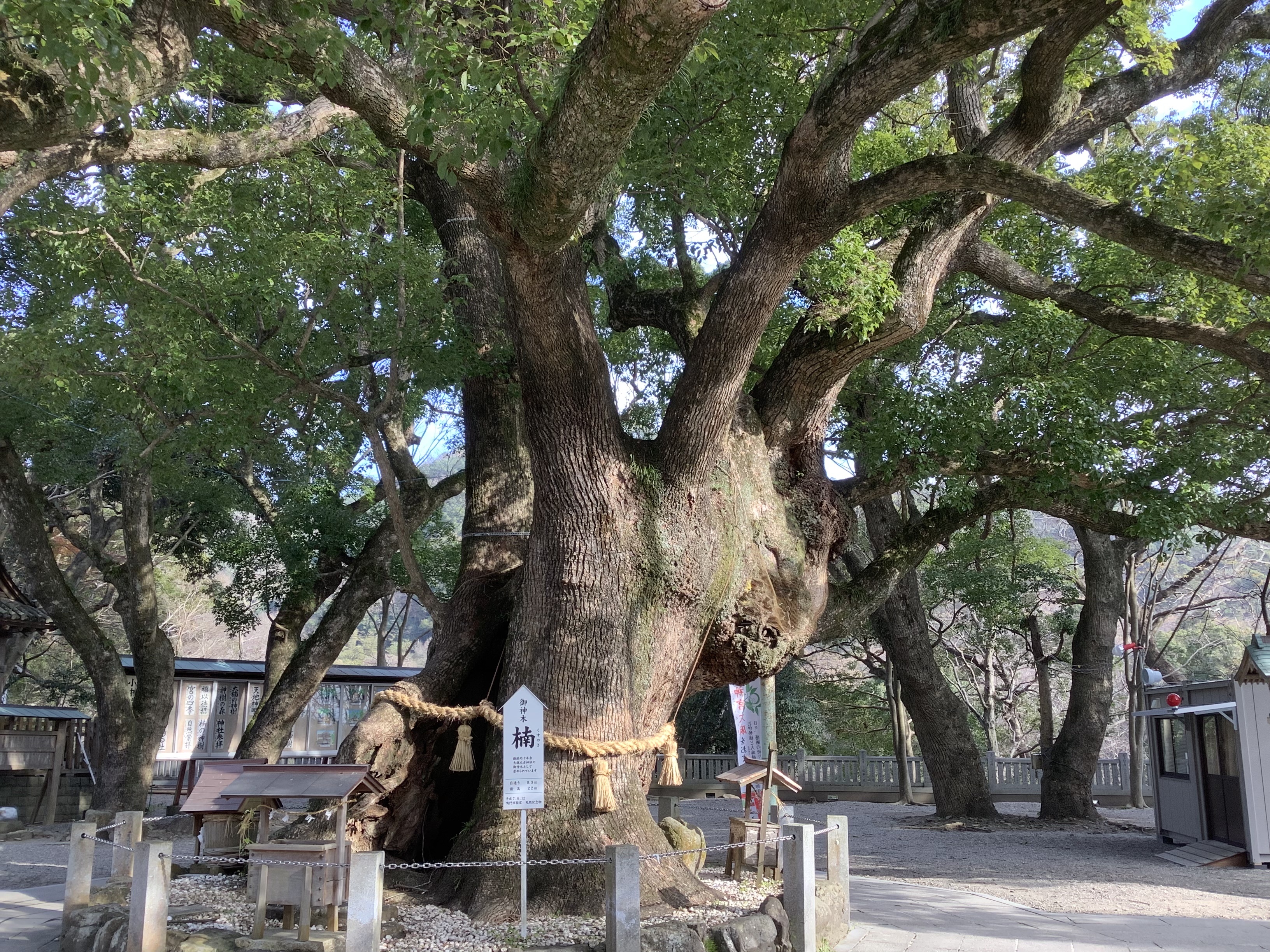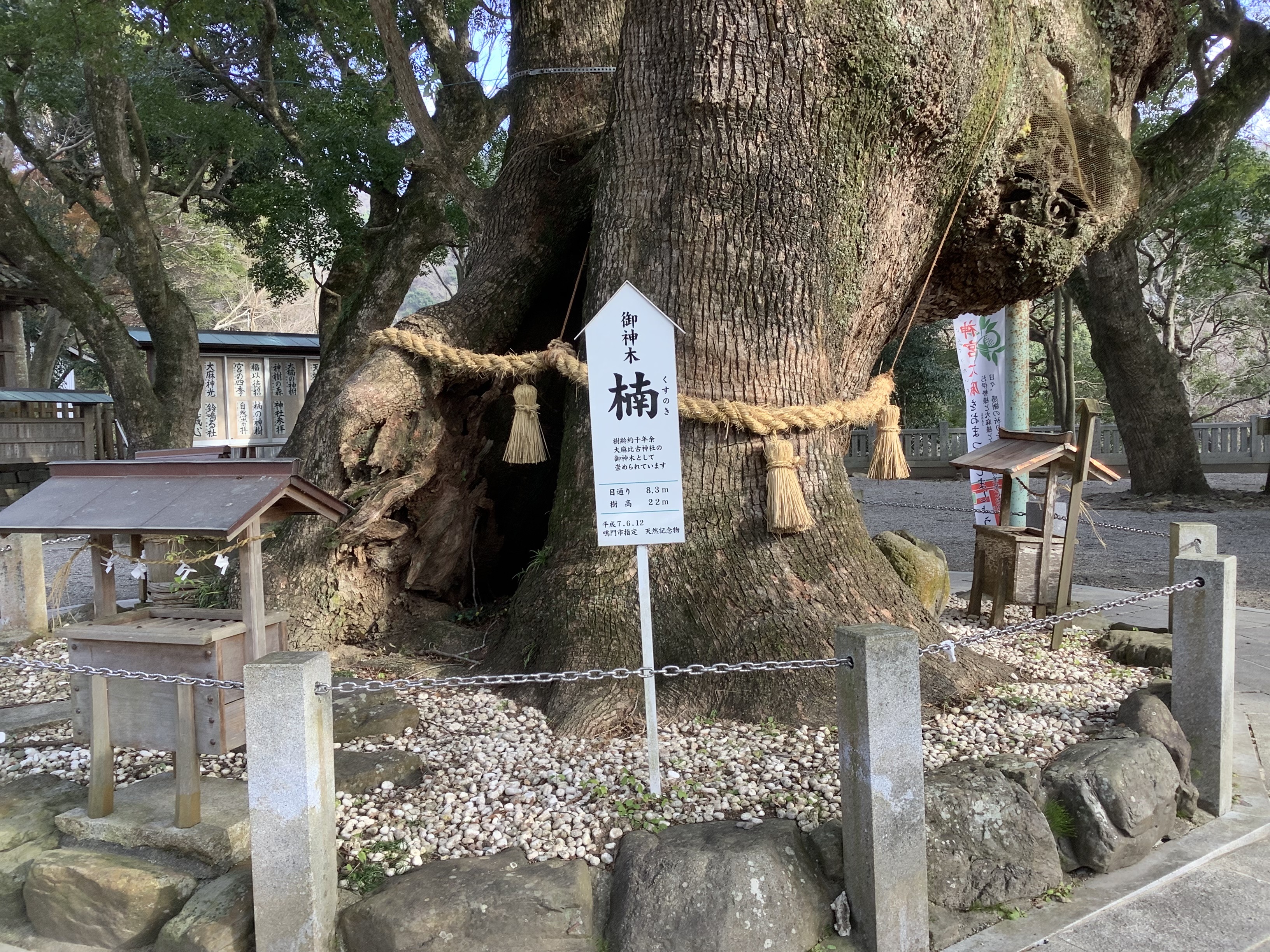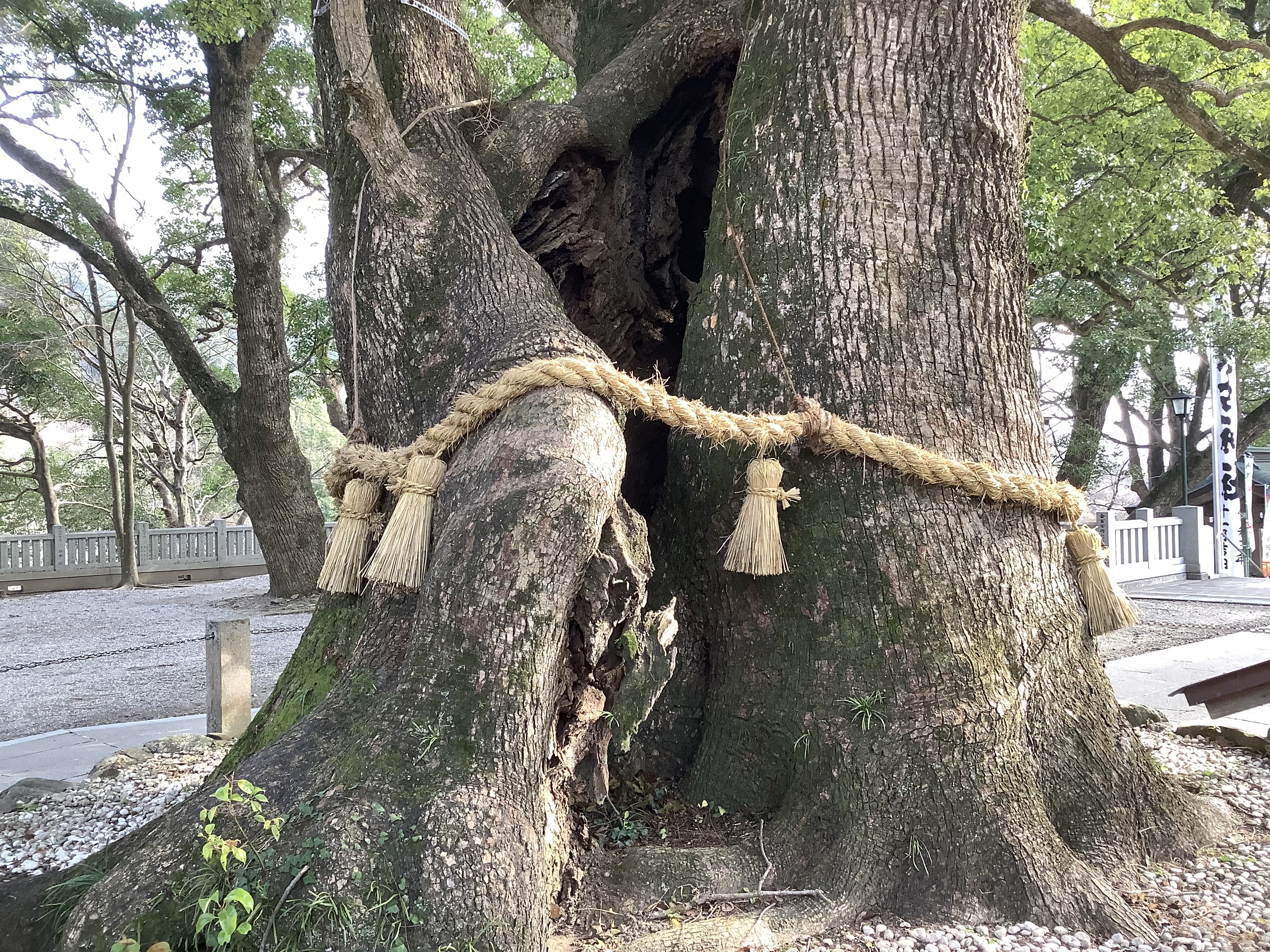 境内にはさまざまな見所がありますが、これぞパワースポットと感じられるのが、神殿正面にそびえるご神木。高さは20m以上、樹齢千年以上とされていて、見上げると圧倒的な力を感じます。大きな枝と茂る葉は生命力に溢れていて、思わず手を合わせてしまう迫力があります。