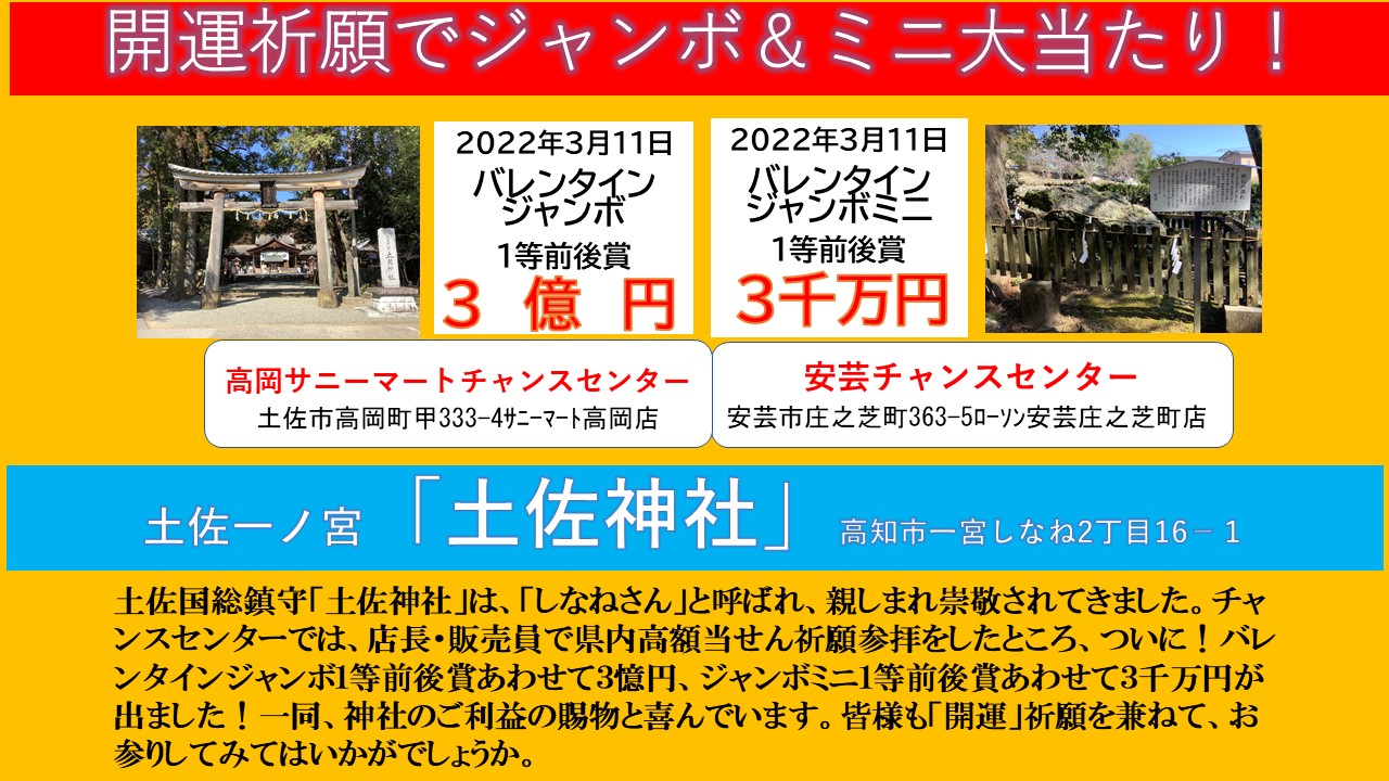 金運スポット 土佐神社に高額当せん祈願で、バレンタインジャンボ&ミニ大当たり!