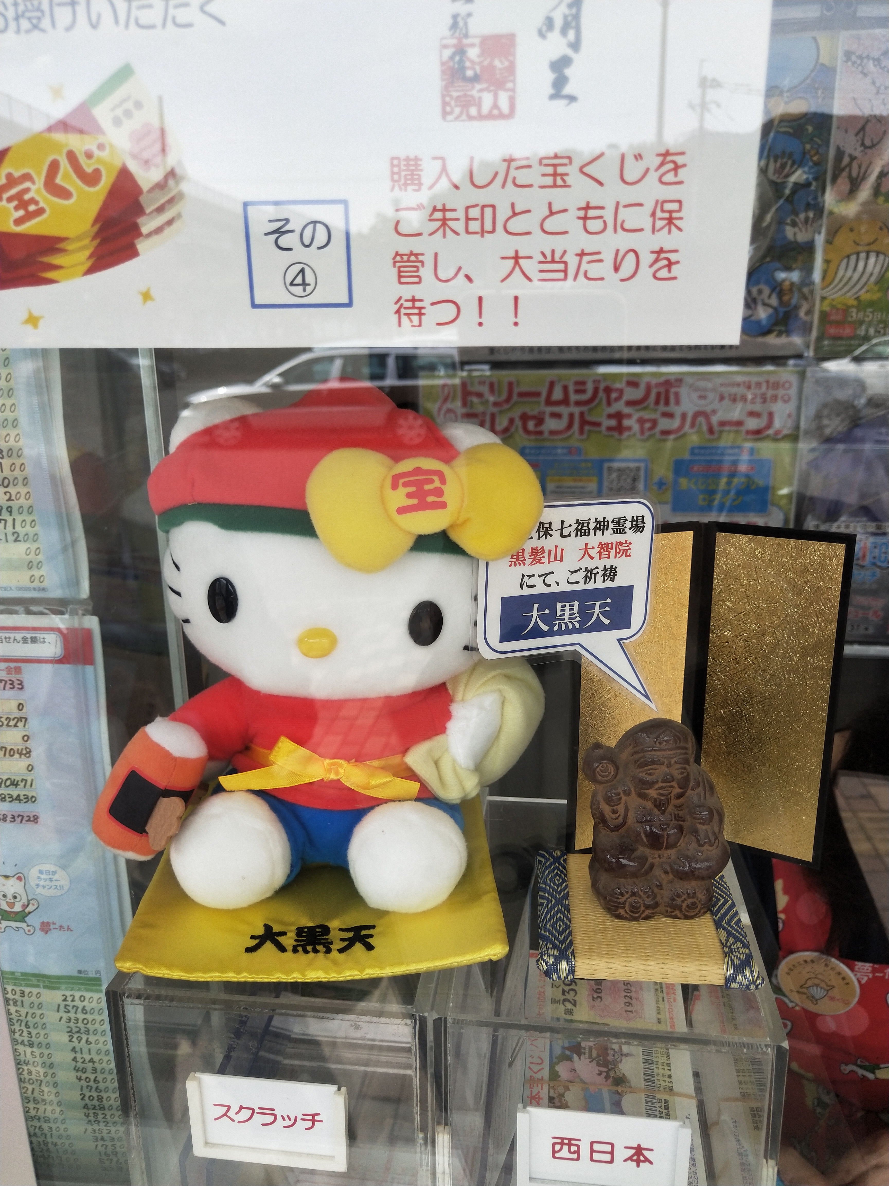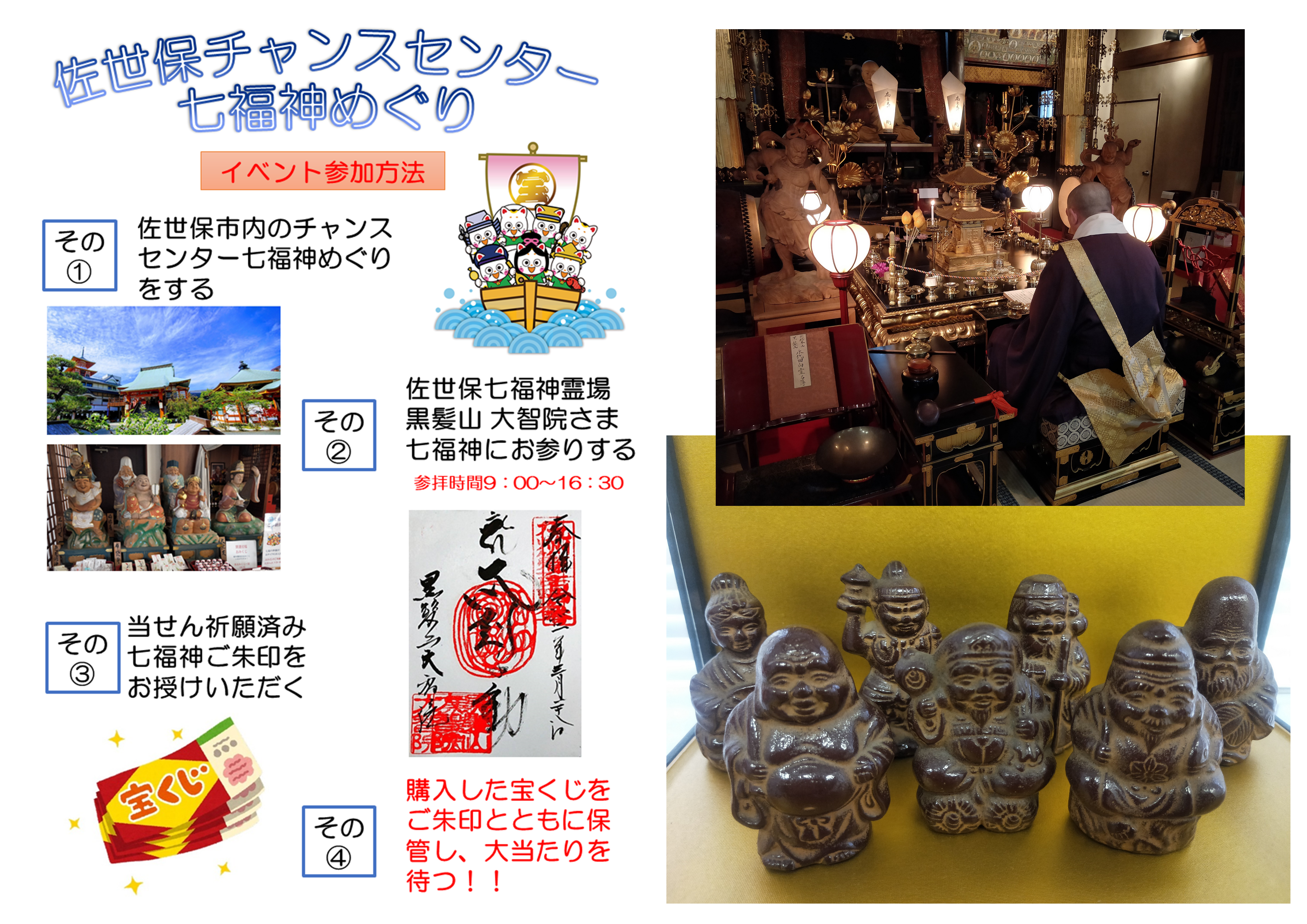 佐世保市内の宝くじチャンスセンターには、佐世保七福霊場 黒髪山大智院さまに特別にご祈祷いただいた七福神を飾っており、七福神めぐりをお楽しみいただけます。宝くじを購入し、七福神スタンプを集め、佐世保七福神霊場 黒髪山大智院さまにお参りいただくと、当せん祈願済みの七福神ご朱印をお授けいただけます。