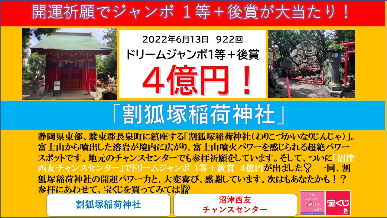 静岡県東部、駿東郡長泉町にあるパワースポット割狐塚稲荷神社をご紹介します。当社の由緒は17世紀初めと言われており、御祭神は宇賀御魂神と言い、伊勢神宮外宮と同様 五穀豊穣・殖産の神様で福富円満・商売繁盛・家内安全・社運隆昌の御神徳を有しています。