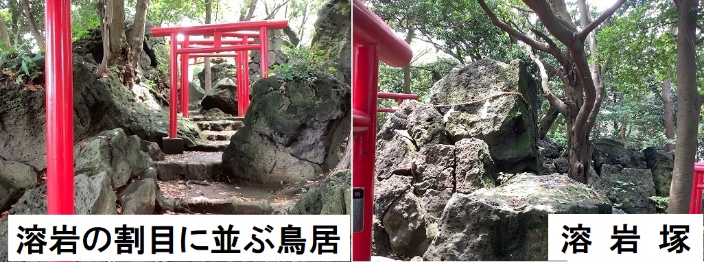 この神社の特徴は境内の至る所に広がる溶岩。そして参道にはその溶岩の割れ目に80基以上の朱鳥居が並びます。ごつごつした溶岩塚に並ぶ朱鳥居は一段と映え、壮観です
