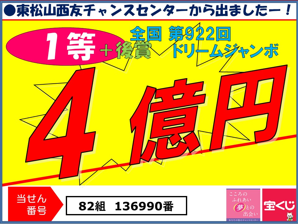 祝!「東松山西友チャンスセンター」で2022年ドリームジャンボ 1等+後賞合わせて4憶円当せん!出ました!!