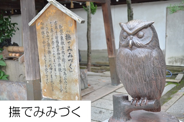 本殿の神様の神使(眷属)は「みみづく」であり、西楼門である総社御門の御神橋や境内に像があります。特に境内のみみづく像は「撫でみみづく」と呼ばれ、参拝の方が神様の御神徳を受けようとこれを撫でます。「縁結び通り」もあり、神様のお陰を存分にお受けいただけます。