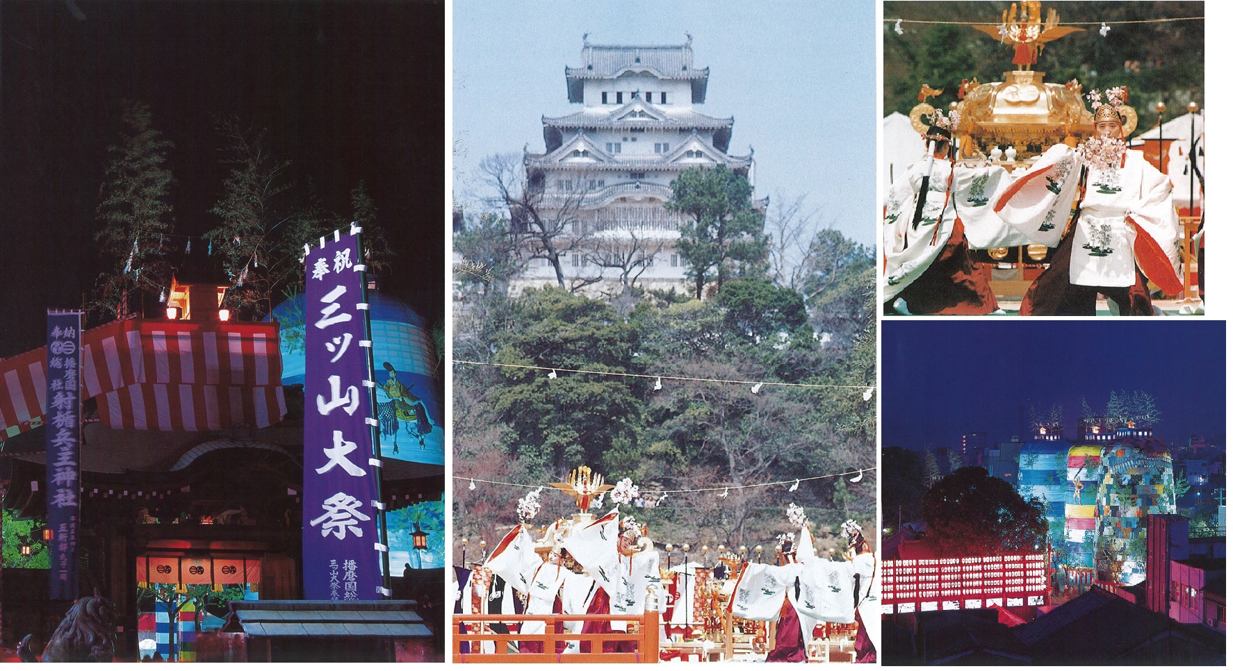 総社では、60年に一度の「一ツ山大祭」と20年に一度の「三ツ山大祭」が全国的に有名です。三ツ山大祭では、神門前に直径10m高さ18mの大きな山(置山)を設け、そこに「播磨の神々」「地元の古くから伝わる9柱の神々」「全国の神々(天神地祇)」をそれぞれお招きして、播磨の国のみならず、国の平安と発展を祈る壮大なお祭りです。