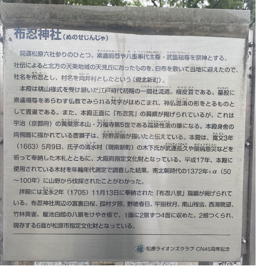 大阪府松原市 布忍(ぬのせ)神社は814年(弘仁5年)創建(諸説あり)。嵯峨天皇の勅願によって弘法大師(空海)が布忍寺の伽藍を再建した際、鎮守として牛頭天王を布忍七カ村の産土神として祀ったとことが由来とも言われている由緒ある神社です