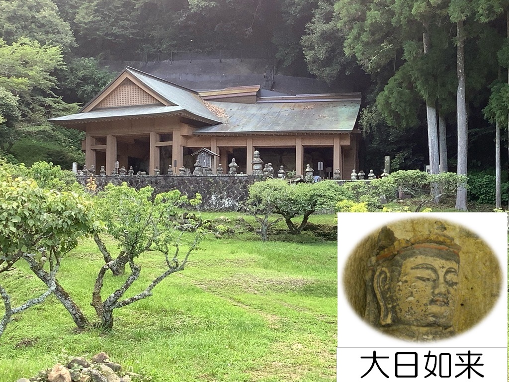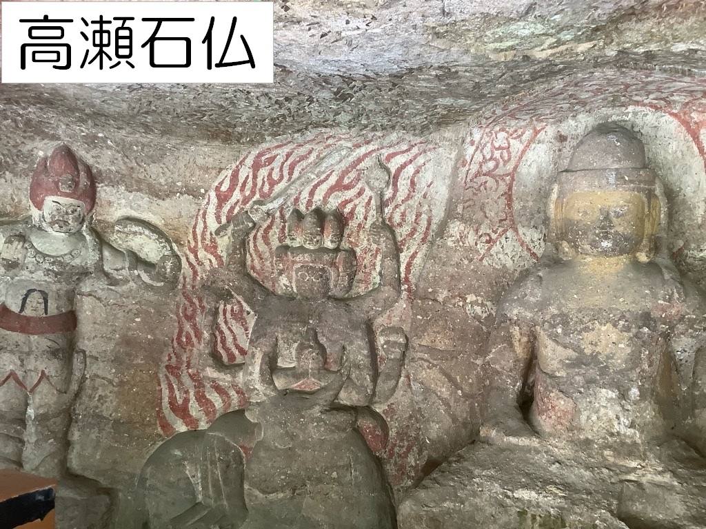 大分市内の最大の商業施設であるわさだタウンの近くにも国の史跡に指定された摩崖仏があります。わさだタウンチャンスセンターから約1㎞のところにある高瀬石仏は、数少ない石窟形式の摩崖仏で、左側の深沙大将像のドングリ眼が印象的です。