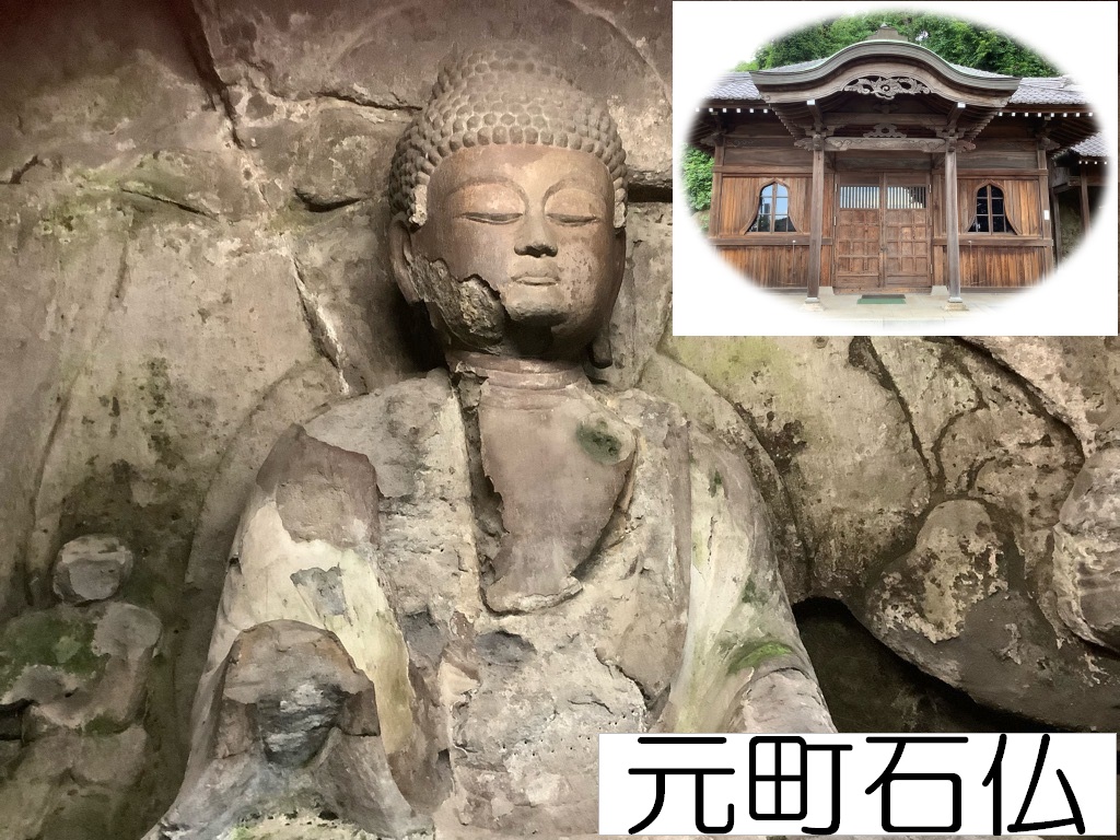 大分市内の摩崖仏をご紹介しましょう。大分駅から1.3キロ、元町ヒロセチャンスセンターから徒歩5分ぐらいに国の史跡に指定されている元町石仏があります。平安時代の作と考えられ、木彫の仏像を彷彿とさせる量感のある体躯と端正で穏やかなお顔立ちなど、定朝(じょうちょう)様式の見事な仏像です。