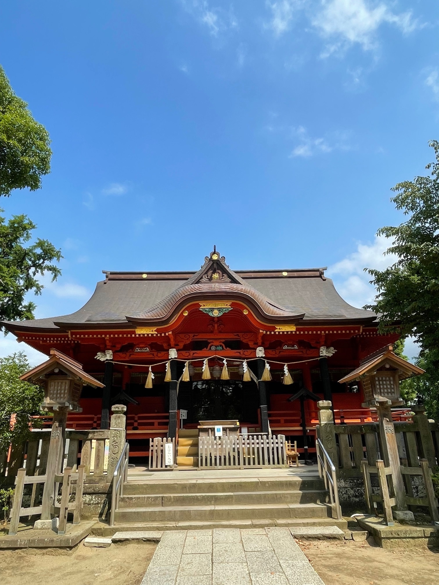 白鳳時代に一国一社の八幡宮として創建され、源頼義義家父子や源頼朝・千葉常胤など武家の崇敬が篤く、天正19年(1591)には徳川家康より社領150石の黒印を受領していました。明治6年郷社に、明治26年には県社に列格していました。本殿は、正面3間、側面2間の総丹塗で屋根は銅板葺の入母屋造りで、室町時代の建物と考えられています。大きく簡素かつ堂々とした和様建築で、国の重要文化財に指定されています。
