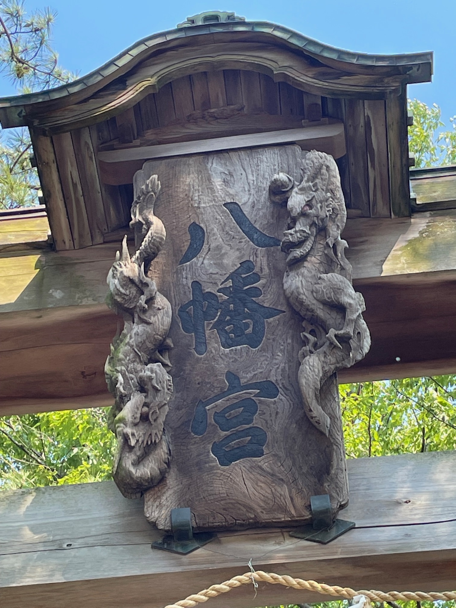 境内に入ると立派な木造の鳥居があります。鳥居の上には八幡宮と書かれた木彫りの額が掲げられ、その両脇には天に向かう龍が彫られています。龍は縁起のいい生き物とされていて、八幡宮を守っているような造りになっていますね。
