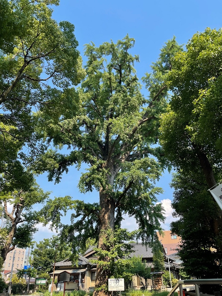 「夫婦銀杏」・飯香岡八幡宮は子育八幡と呼ばれるように安産子育の神として崇敬され、このイチョウも二本の巨幹が根本より分岐するところから夫婦銀杏と名付けられ、安産子育のシンボル(象徴)としてます。