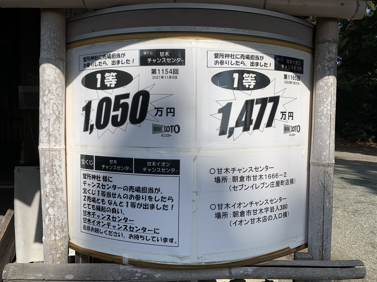 最近では、近隣の甘木チャンスセンター甘木イオンチャンスセンターの売場担当者が、当所神社に当せん祈願のお参りしたところ、なんと2つの売場でミニロト1等が出ました!