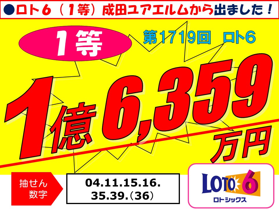 ロト6 1等 1億6,359万円 「成田ユアエルムチャンスセンター」から出ました!(2022年8月29日)