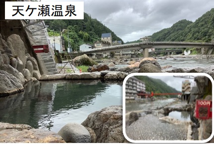 日田サニー・日田ダイソーと2か所のチャンスセンターがある日田市中心部から車で約20分、玖珠川沿いの天ケ瀬温泉には、川床にいくつかの露天風呂があり、素晴らしい景観と川のせせらぎを聞きながらまるで川の上で寛いでいるように入浴することができます。泉質は無色透明の硫黄泉、令和2年の集中豪雨の被害から復旧・復興途上にある温泉街です。