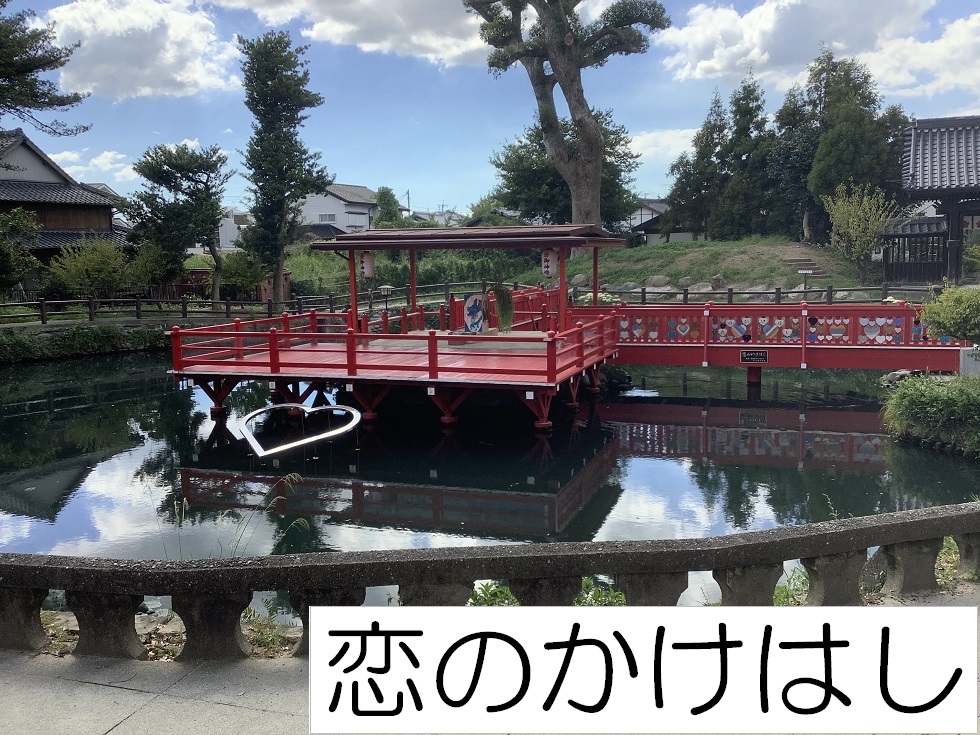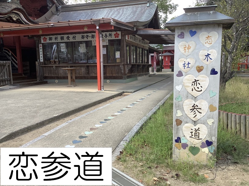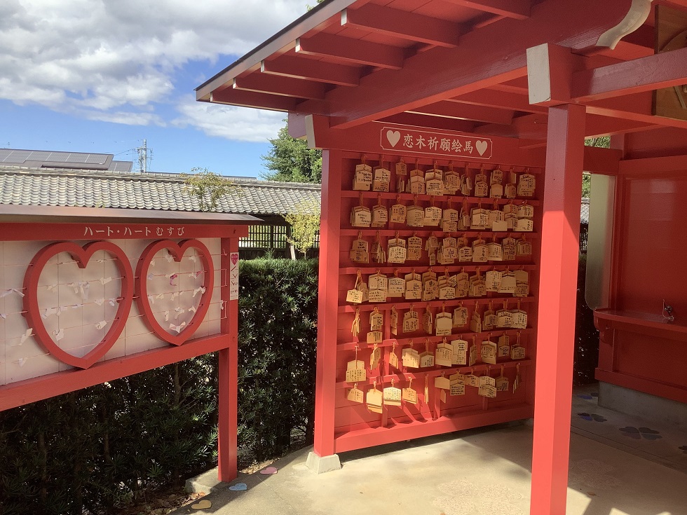 境内のいたる所にハートのマークが溢れ、おみくじを結ぶおみくじ掛けはハート型、池には恋のかけはしが架かっています。また神殿に続く恋の道「恋参道」には地元の水田焼を使ったハート型の陶板が埋め込まれ幸せ気分満載です。今も昔も人々の幸せを願う気持ちに変わりはありません。