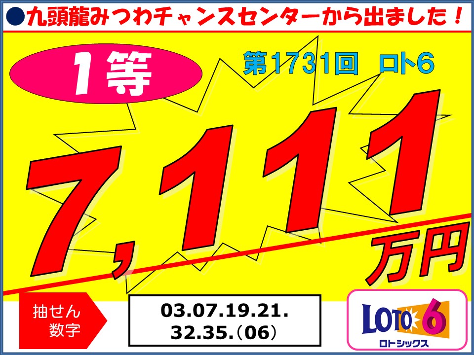 ついに出ました!「九頭龍みつわチャンスセンター」から、ロト6 1等 7,111万円!