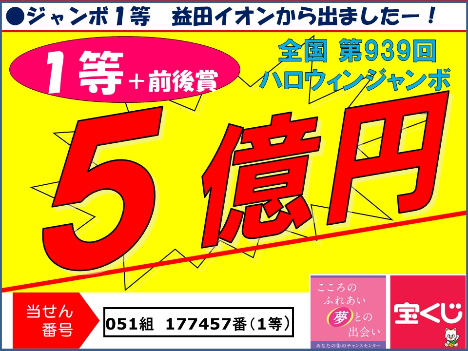 2022年10月 ハロウィンジャンボ1等前後賞合わせて5憶円! 「益田イオンチャンスセンター」から出ました!