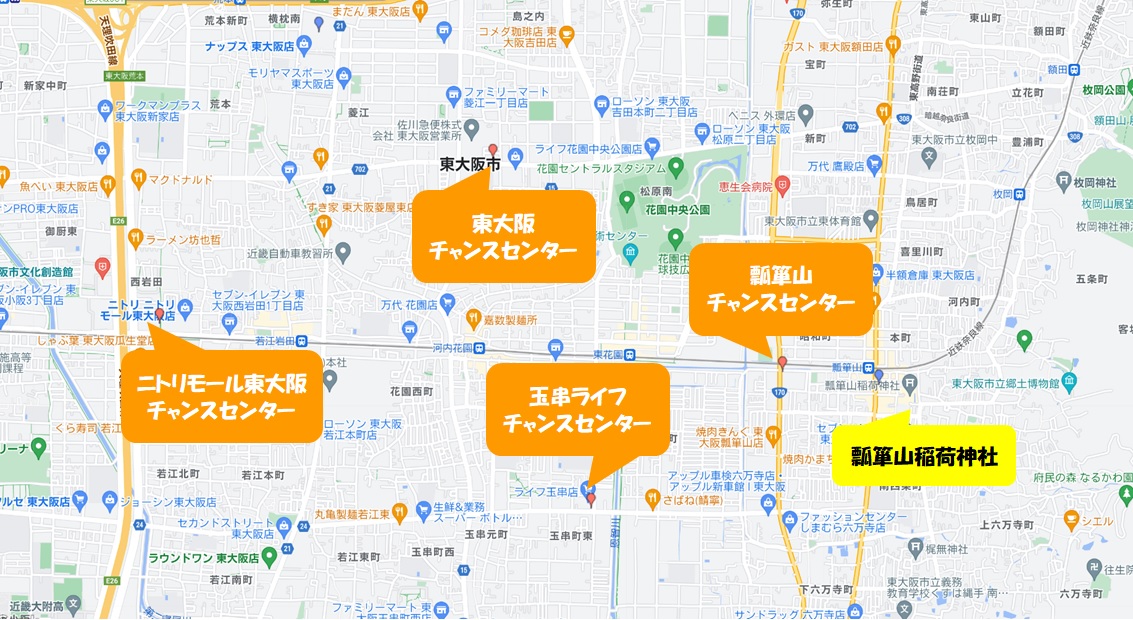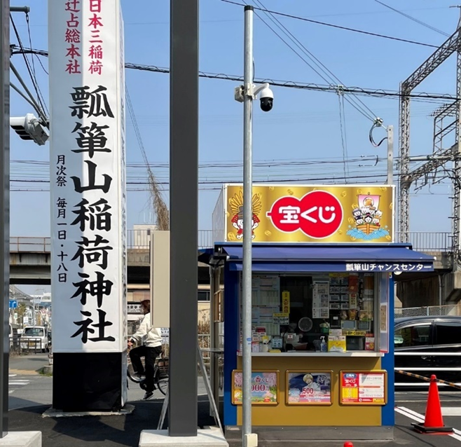 神社より西へ700mの幹線道路沿いにある「瓢簞山稲荷神社」大看板の隣には、瓢箪山チャンスセンター(宝くじ売場)があります。瓢簞山稲荷神社の金運パワーのご利益か1232回のロト6で1等2億円が出るなど多くの大当たりが出てまっせ~!