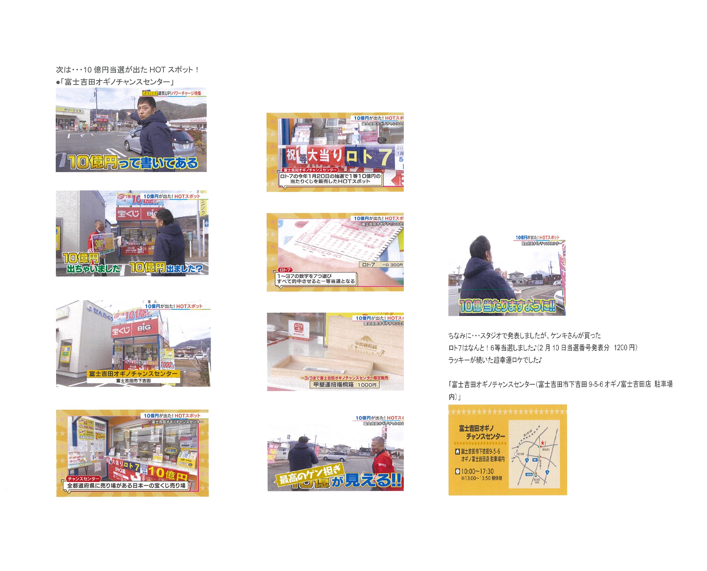 UTYの情報番組「スゴろく」の人気コーナー「週刊中年KENKI」で、「運気アップ!パワーチャージ特集」として、富士吉田オギノチャンスセンターで出た「ロト7 10憶円」の話題が紹介されました。