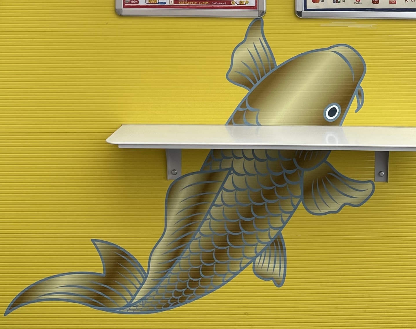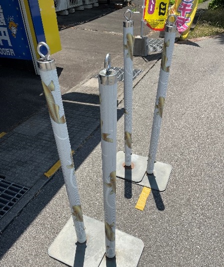 更に、売場の前にある4本のパーテーションポールにも「金の鯉」を計12匹貼り、滝に見立てた売場の青い柱には「鯉の滝登り」をイメージした「金の鯉」を3匹掲げ、全部で18匹の金の鯉(18金の鯉)を売場全体に施しました。(売場へ18金の鯉をプレゼントしました)