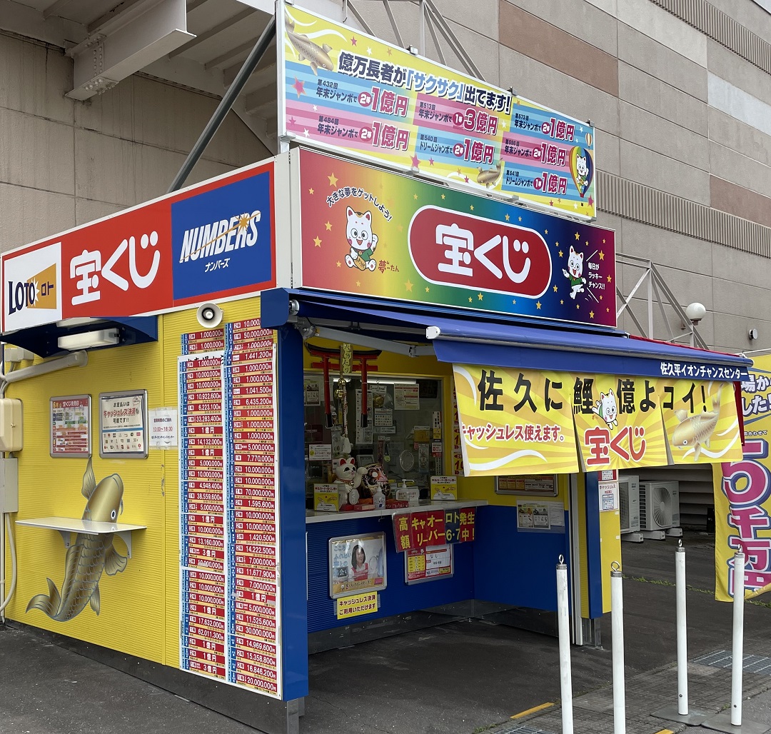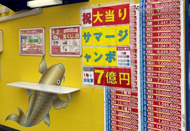 売場の横に掲示されている高額当せん実績ボードが過去からの当せん内容を称えています。