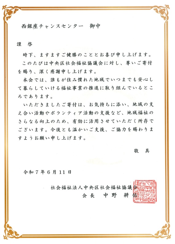 ジャンボ宝くじ販売期間中に「宝猫」募金箱を通じ宝くじファンの皆さまから頂きました浄財を、「中央区社会福祉協議会様」へ募金させて頂きましたのでご報告させていただきます。